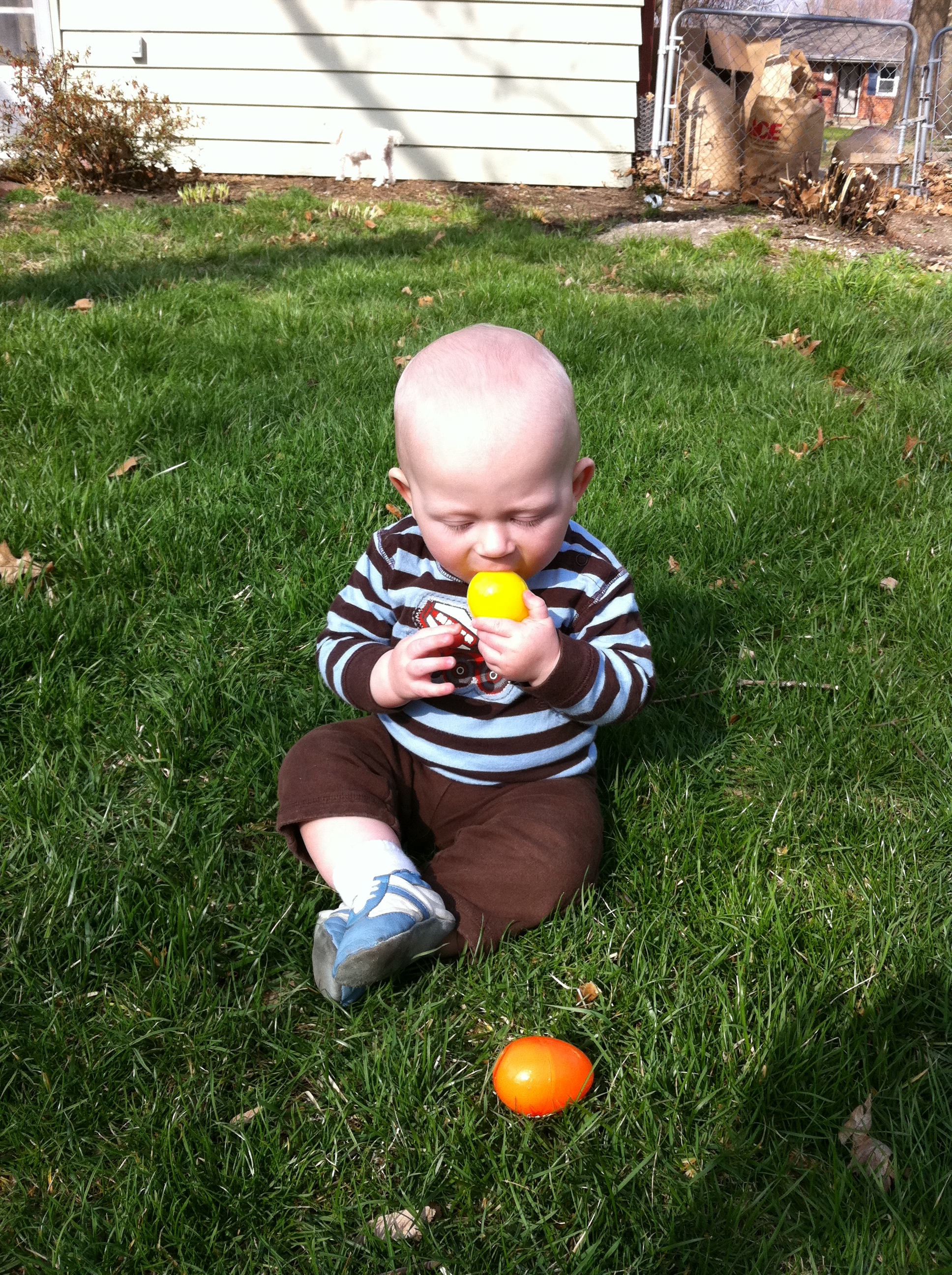 I got to play with two of my cousins this week- Lillie and Diene. They are so cool and LOVE to play- they totally get me. We decided to practice our mad Easter egg hunting skills at Gigi’s house. I finally found some (with some help from mom), and this is a pic of me trying to figure out what’s inside…yummy