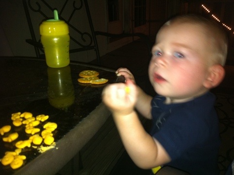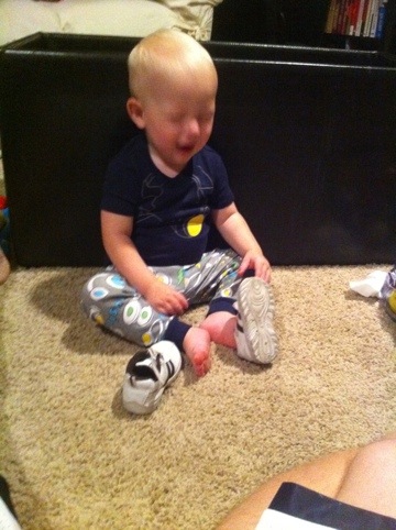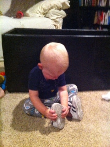 I then tried to put on my shoes and worked at it for about 10 min. I didn’t make much more progress than what you see below. But dad and I did have fun playing “peeyou” but this time I was in charge.